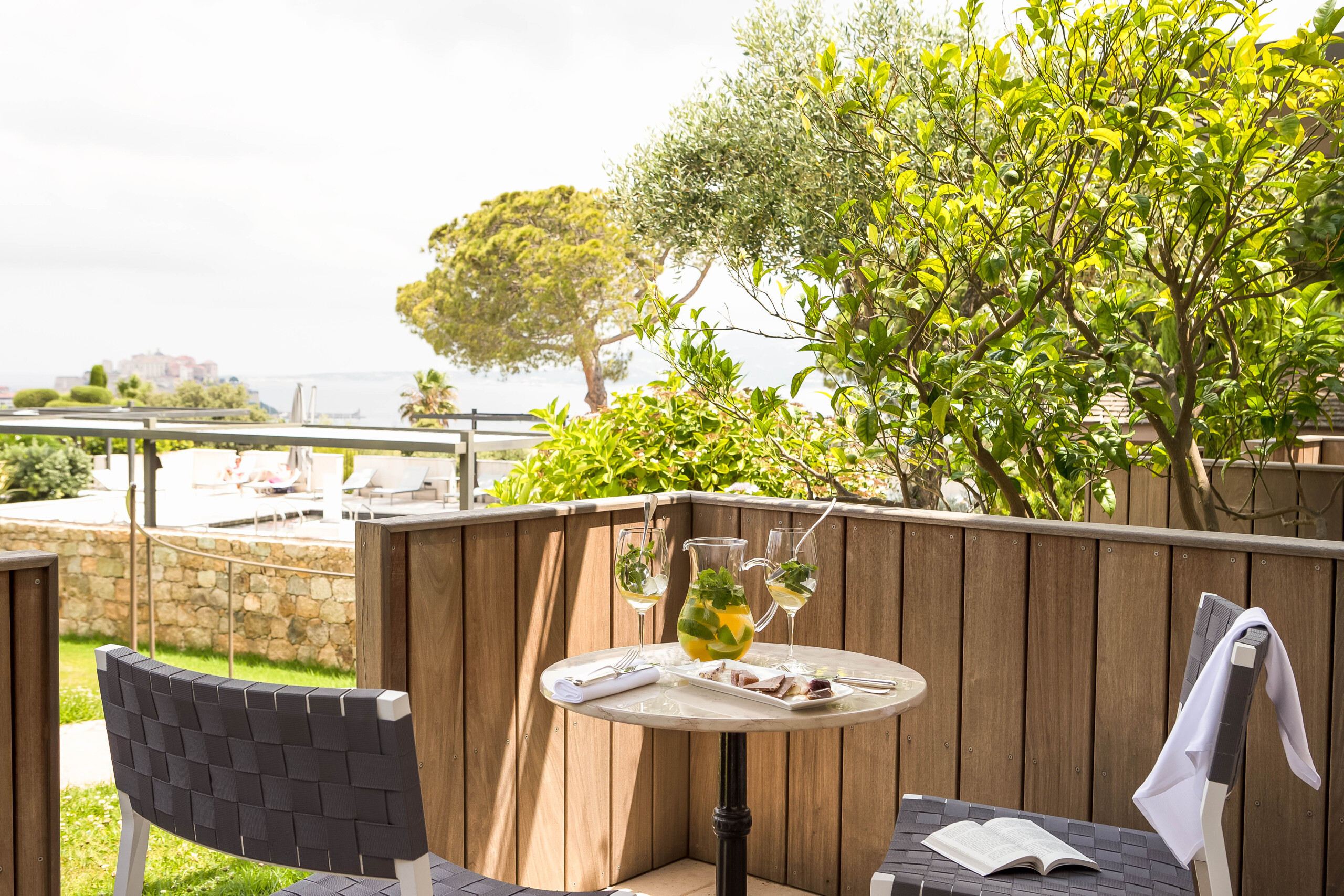 Nestled in the heart of our estate, this exclusive space invites you to savor refreshing drinks and light meals while admiring the breathtaking view over the Bay of Calvi.